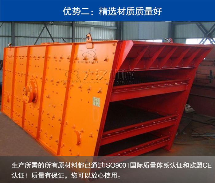 大漢機械生產的圓振動篩在選材是上精益求精,精選的優質不銹鋼和碳鋼兩種材質供您選擇,我們保證每次選用的原材料都是進行質量檢測合格之后才加工使用,生產所需的所有原材料都已通過ISO9001國際質量體系認證和歐盟CE認證!質量有保證,您可以放心使用。