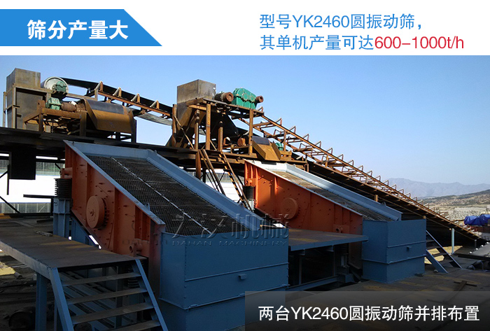 型號YK2460圓振動篩,其單機產量可達600-1000t/h,在時產2000噸的鐵礦石生產線中,兩臺YK2460圓振動篩并排布置,便可輕松達到生產線篩分產量要求,篩分產量是非常可觀的。